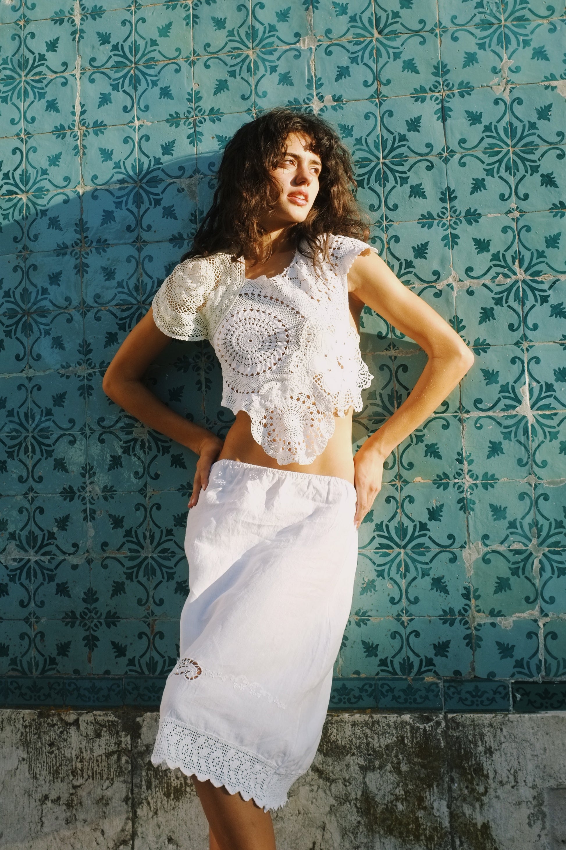 Backless top with overhead entry. Made from vintage doily's and crochet laces.