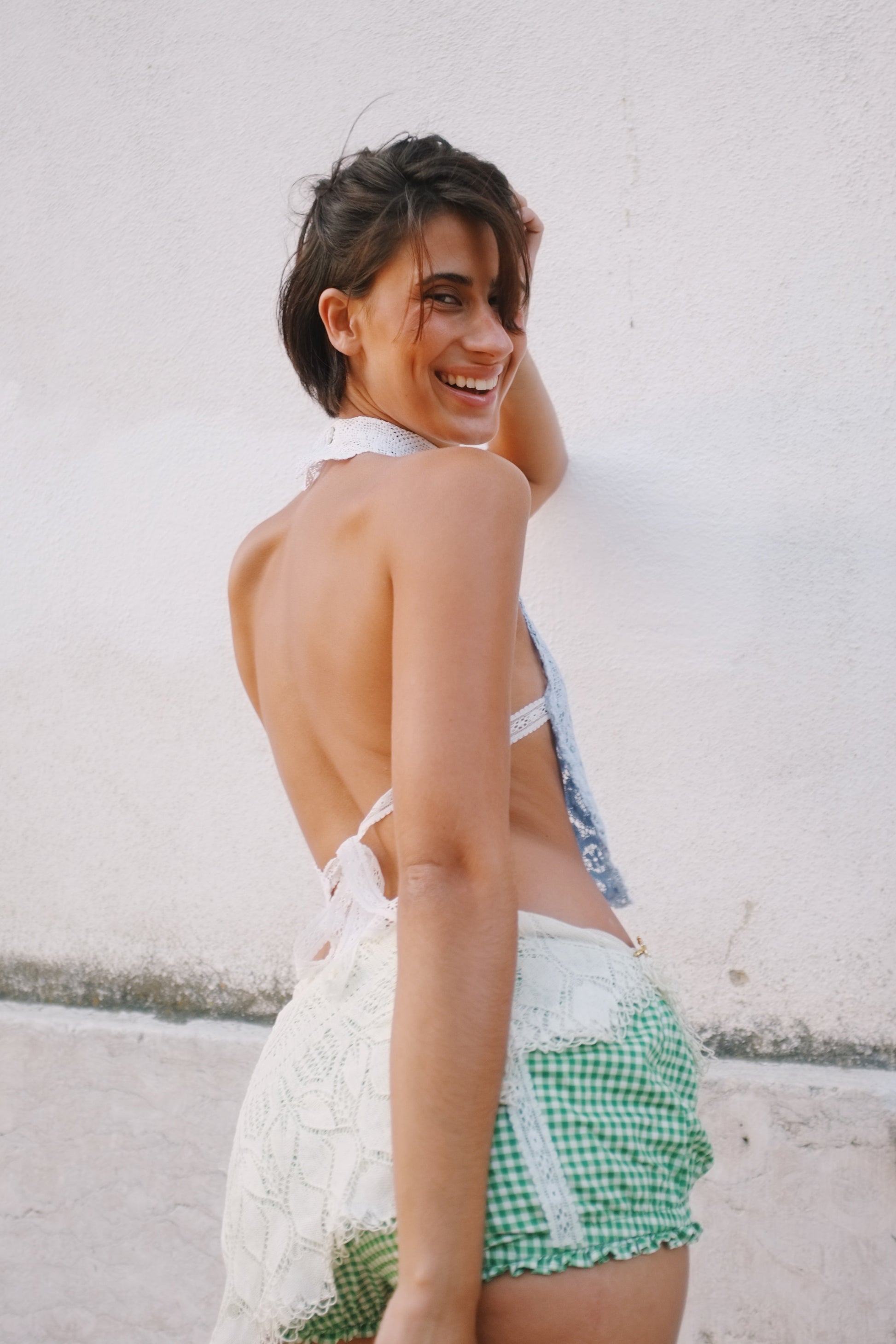 Forget me not blue and white crochet halter top with lace back ties and pearl button neck fastening.