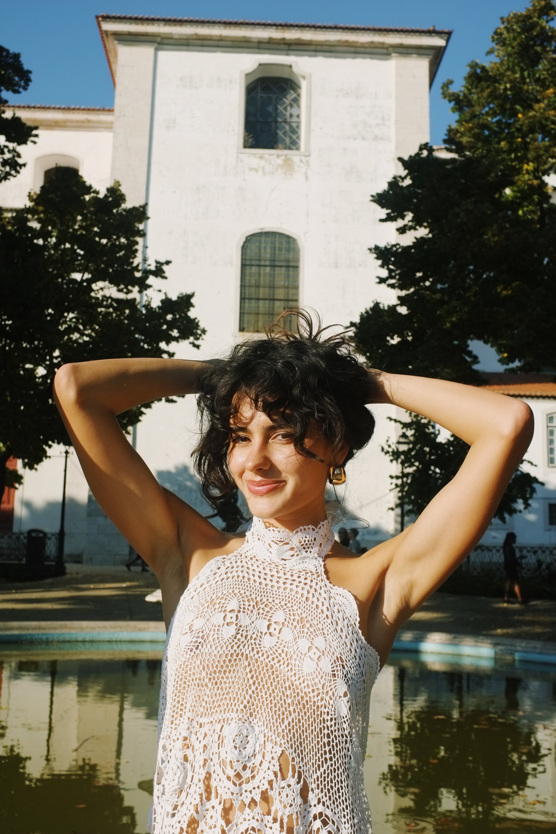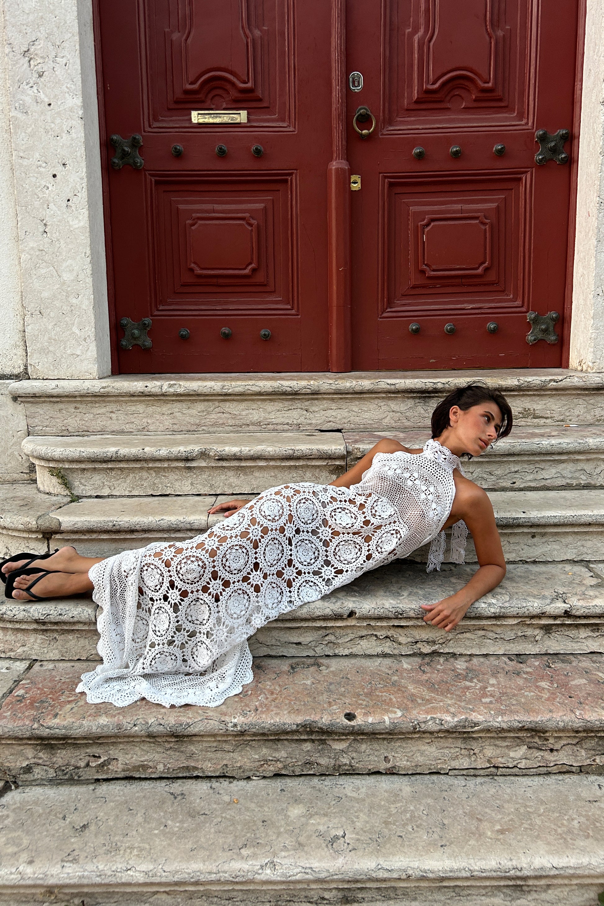 Crochet maxi dress with antique lace halter tie fastening.