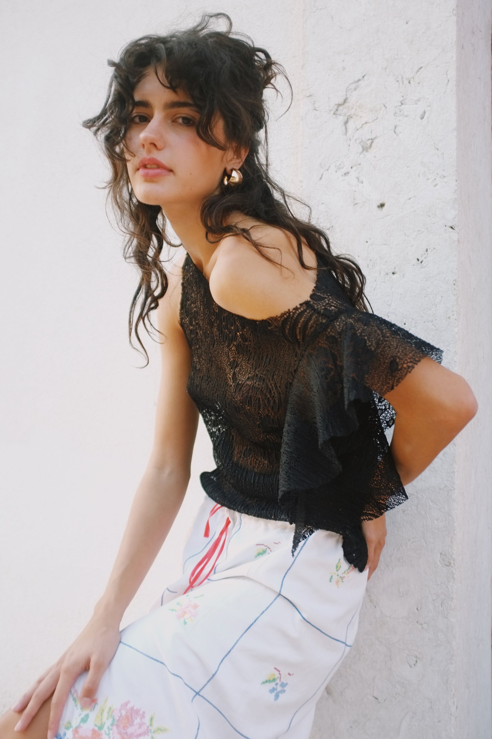Deadstock crinkle crochet lace top with flounce frill sleeve, raw edge finishing.